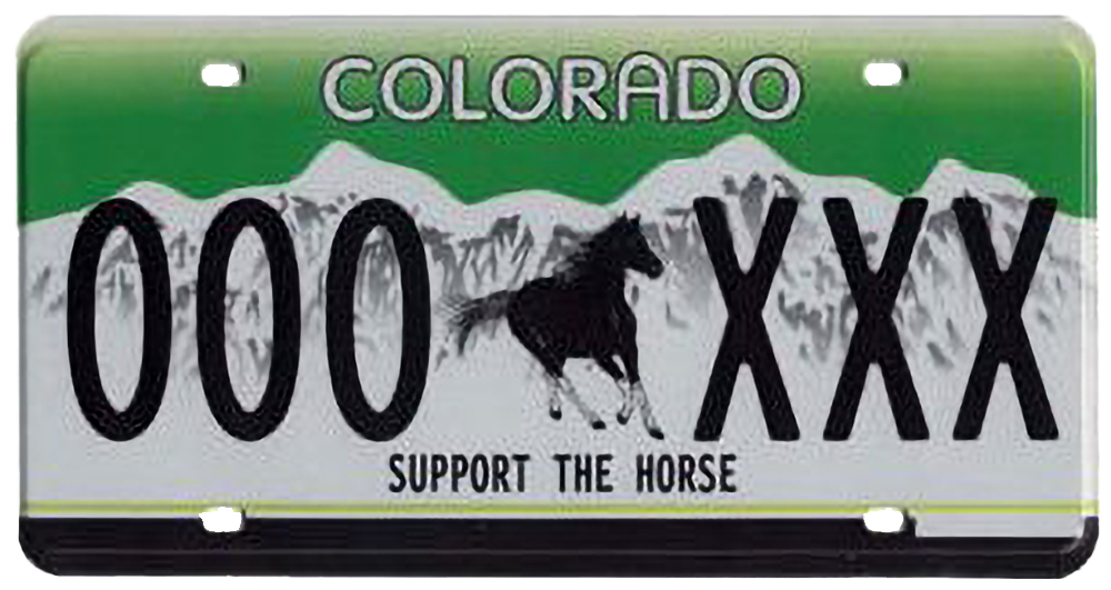 The special plates bear the image of a horse and the words, “Support the Horse.” Proceeds from the sale of the plates will benefit the Colorado Horse Industry by education and other programs of value to the horse industry in the state.
